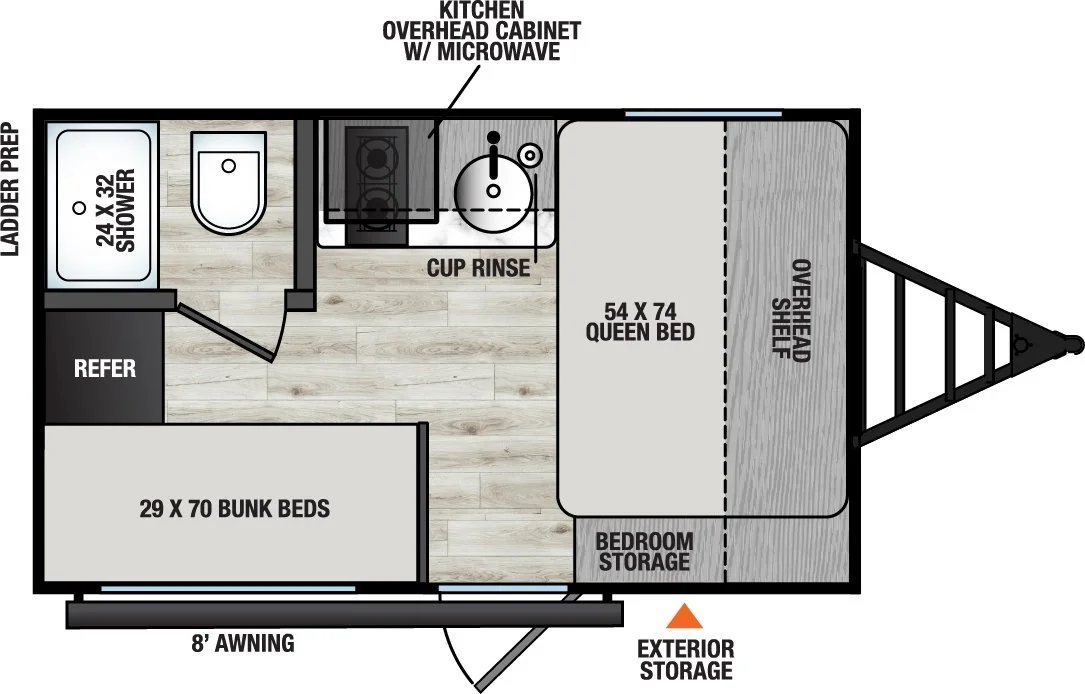 One of the smallest Bunk model floorplans available, the 12BH has space to sleep 4 while still offering a 2 burner cooktop, microwave, on demand water heater, 20K BTU furnace, shower and toilet. These can be optioned with 200W solar, All Terrain tires, and backup camera prep. All of these can be had of a package coming in at less than 4,000 GVW.